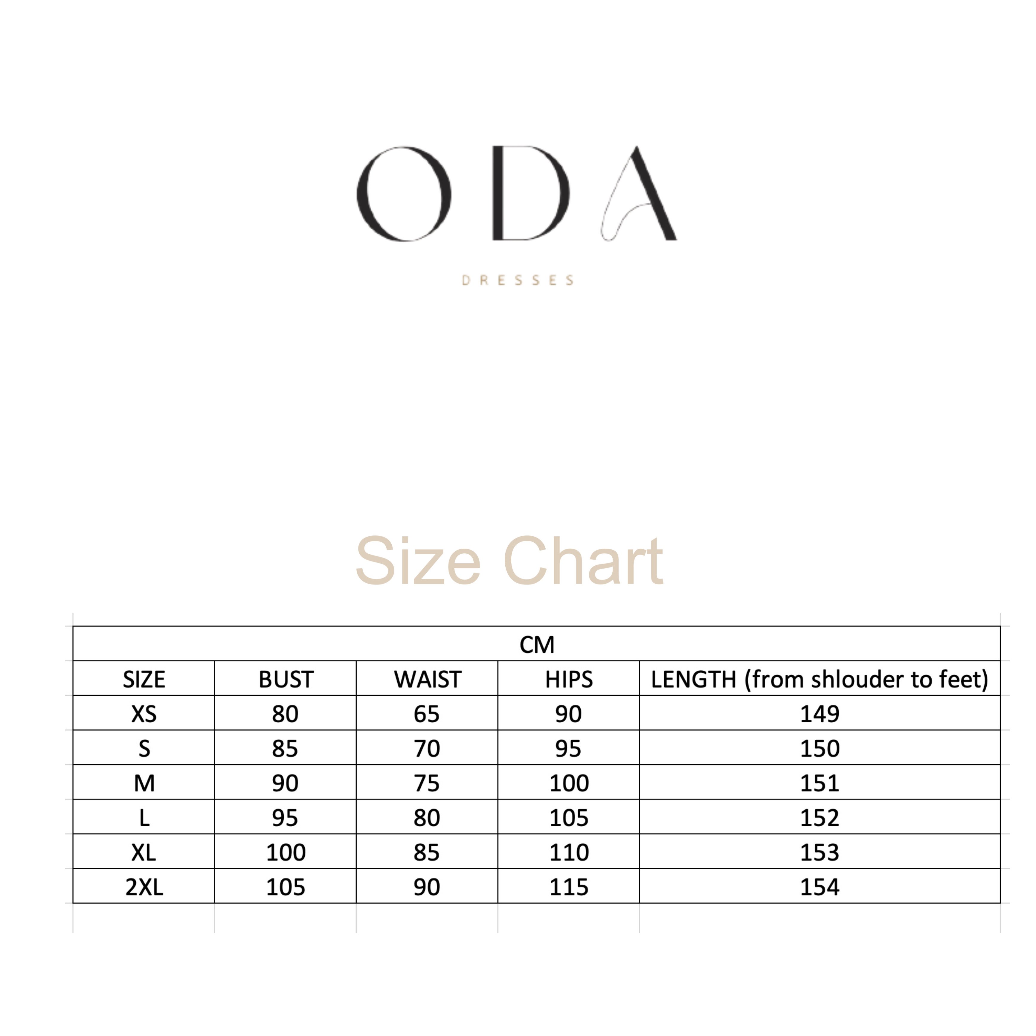 النوع: فستان (تفصيل) اختيارك حسب جدول المقاسات المقترح او تزويدنا بمقاساتك واختيار مقاس مخصص وكتابة المقاس بالملاحظات (الصدر-الوسط-الورك--طول الفستان من الكتف )